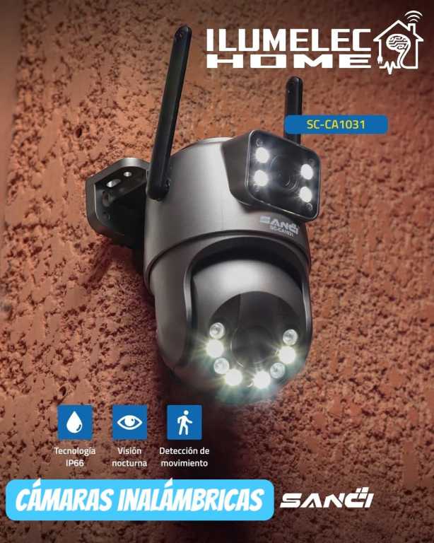 Cámara Inalámbrica para exterior de 2Mp. con detección de movimiento e infrarrojo. Ranura para Memoria Micro SD. Doble Lente. Un lente fijo y otro lente de 360° giratorio. Tecnología IP66