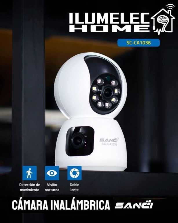 Cámara Inalámbrica de 2Mp. con detección de movimiento e infrarrojo. Ranura para Memoria Micro SD. Doble lente. Un lente fijo y otro lente giratorio de 360°.